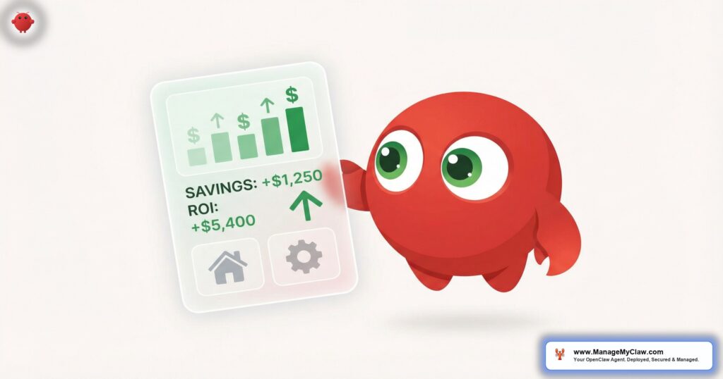Your costs: $499 one-time deployment through ManageMyClaw + approximately $25/month for VPS hosting + $10–30/month for LLM API usage depending on volume. Total first-year cost: roughly $920. Total first-year return: $43,200. That’s a 47:1 ROI.