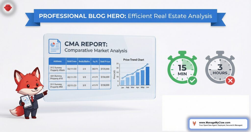 This guide walks through exactly how OpenClaw automates the CMA workflow — where the data comes from, how the comparables get filtered and ranked, what the output looks like, and the time difference between doing this manually and letting the agent handle it. If you’ve been losing listing appointments because somebody else showed up with market data faster, this is how you fix that.