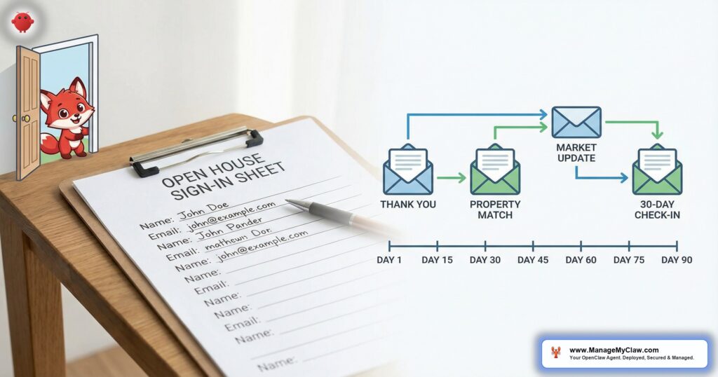 Open house follow-up ai isn’t a futuristic concept — it’s the gap between your sign-in sheet and your commission check. OpenClaw is an open-source AI agent framework (250,000+ GitHub stars, bare-metal deployment under systemd) that connects to your Gmail via Gog OAuth, reads your calendar, and automates the entire post-open-house workflow: thank-you emails within 2 hours, property matching based on stated preferences, and nurture sequences that re-engage visitors at 30, 60, and 90 days.