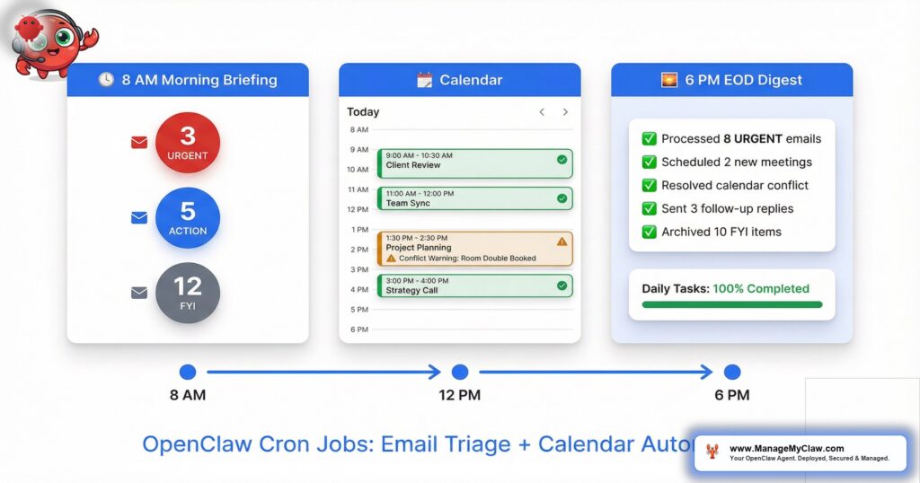 Every production OpenClaw setup runs these 3 scheduled jobs. They cover the daily workflow loop: what happened overnight, what’s happening now, and what happened today.
