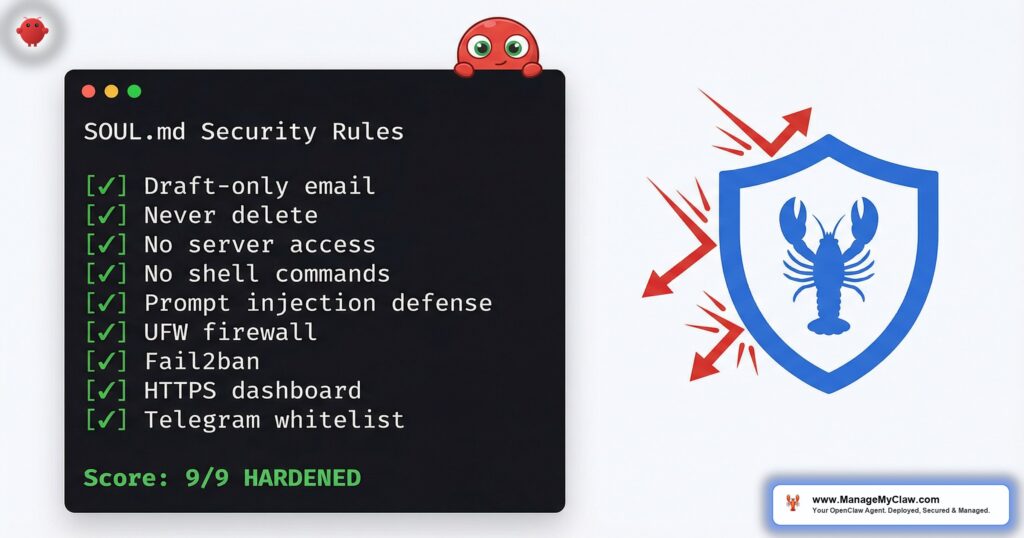 This post covers the 9-point SOUL.md security framework we add to every deployment, the 50+ prompt injection tests we run before handoff, and the server-level protections (UFW, Fail2ban, HTTPS, Telegram allowlists) that turn an open agent into a locked-down production system. Every template in this post is copy-paste ready.